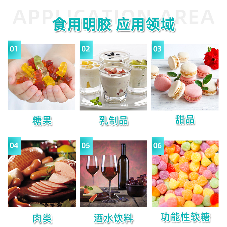 明膠具有獨特的熱可逆性凝膠能力,可在溫水中溶解,冷卻后成凝膠狀。由于其擁有凝膠、發泡、乳化和粘合等功能,明膠最常用于糖果、果凍等食品中。